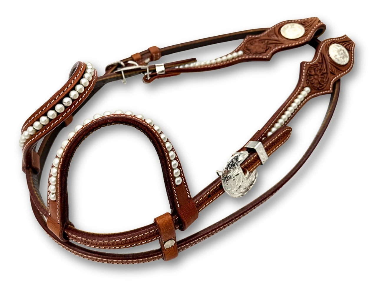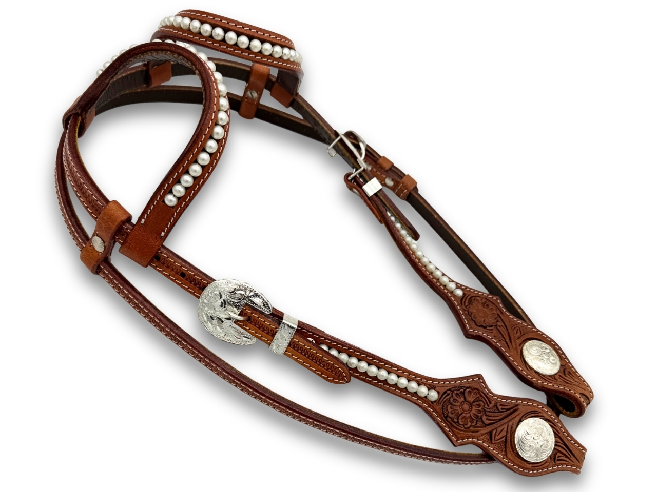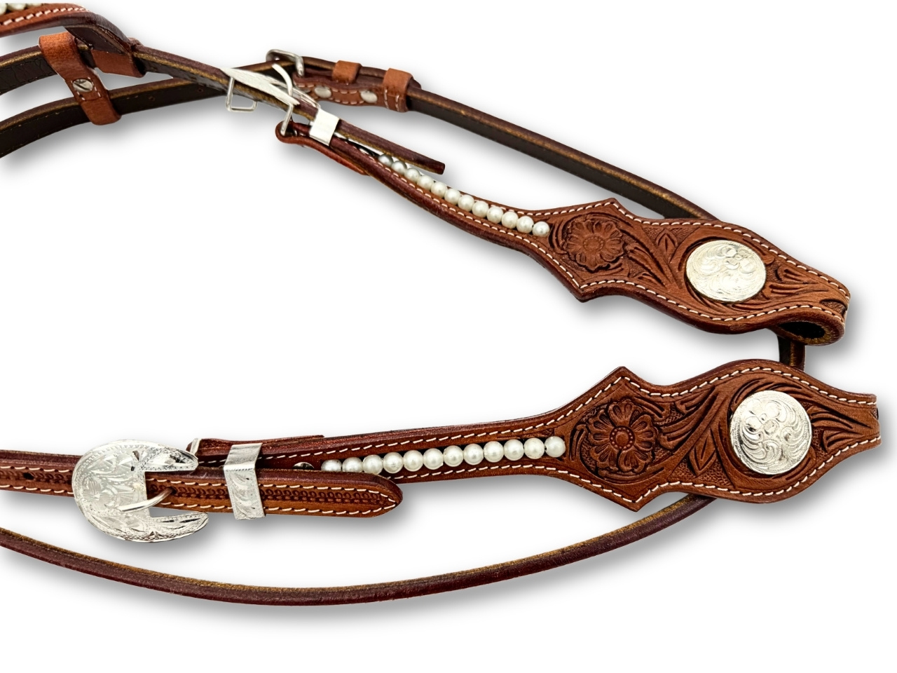 Elegant Two Ear western bridle with pearls and throat lash, medium brown