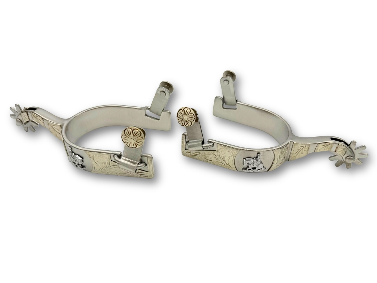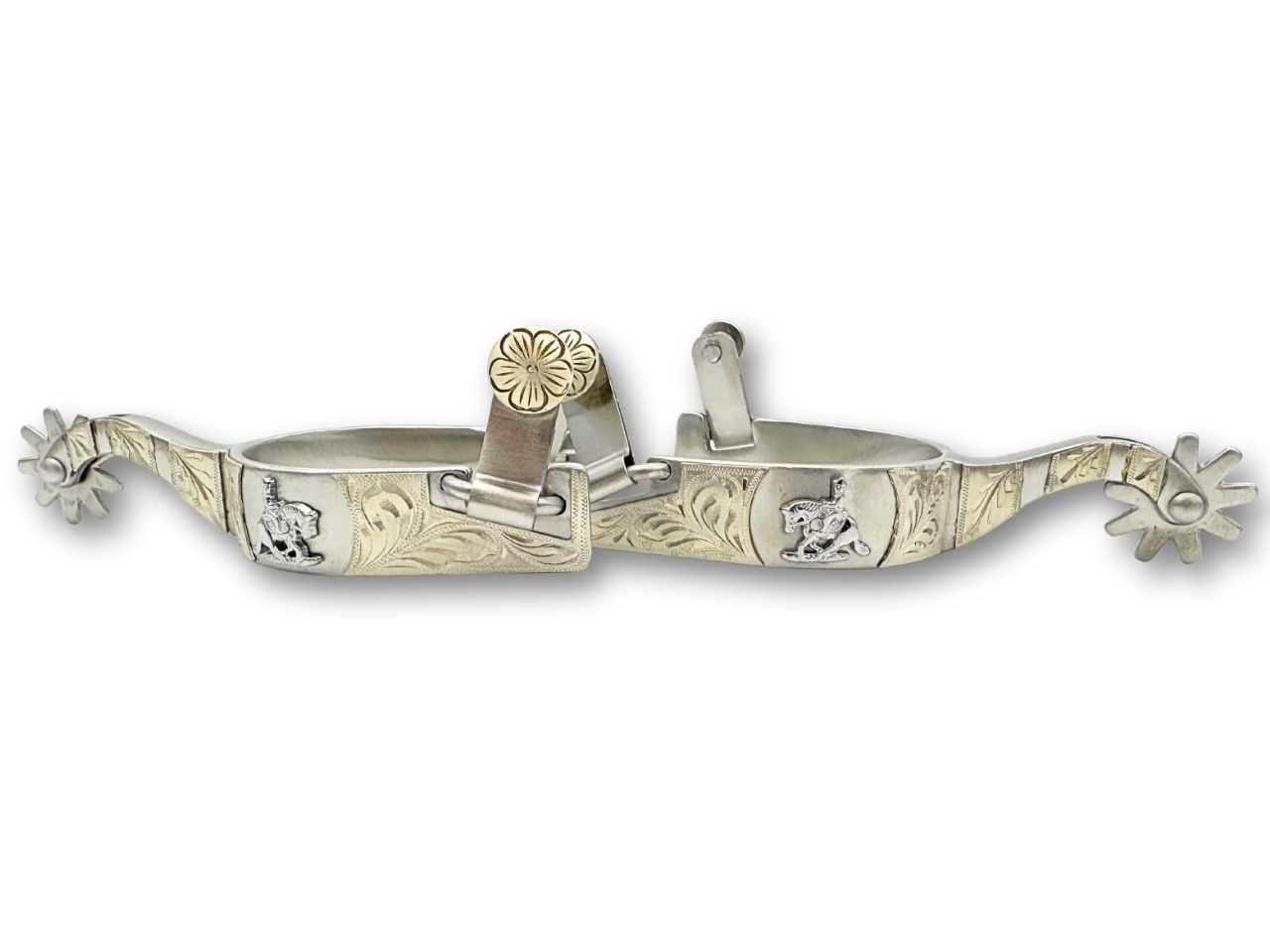 Western spurs silver with engraved decoration and reining horse emblem, wheel spurs